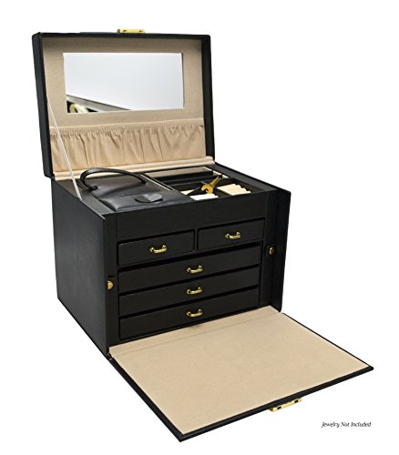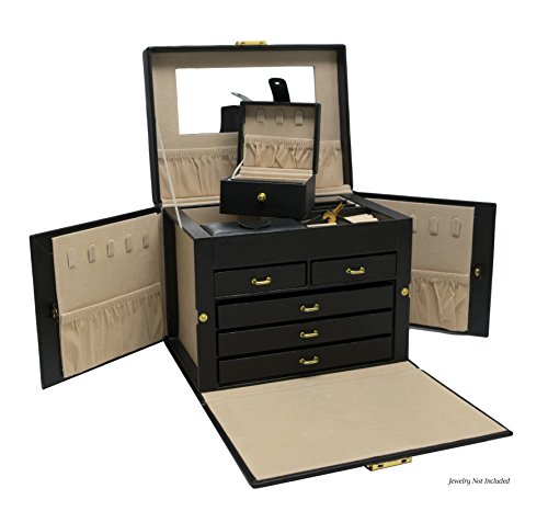 5 slide out drawers; 20 compartments;10 necklace hooks;3 large storage pouches;Lined in silsuede and finished in oiled leather and durable synthahide;