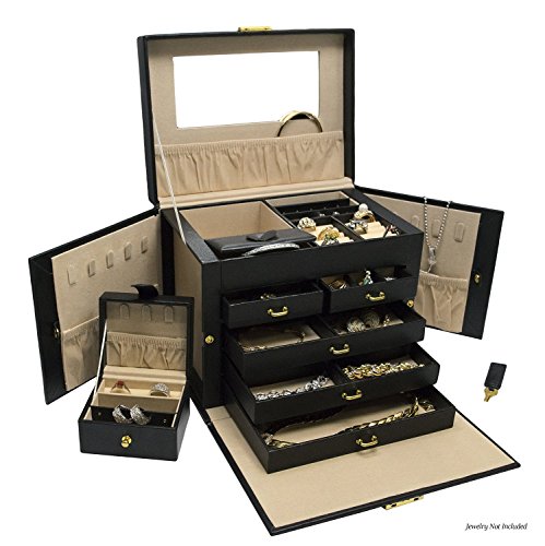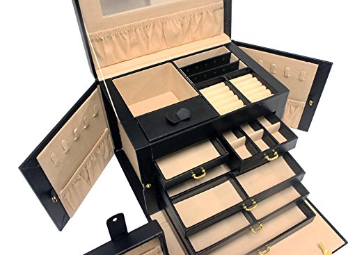 Lock with a key ;Large mirror on top lid;removable mini travel jewelry box (shown at rear left of the jewelry box) that holds even more rings/necklaces/earrings and other jewelry.. perfect for any trip!