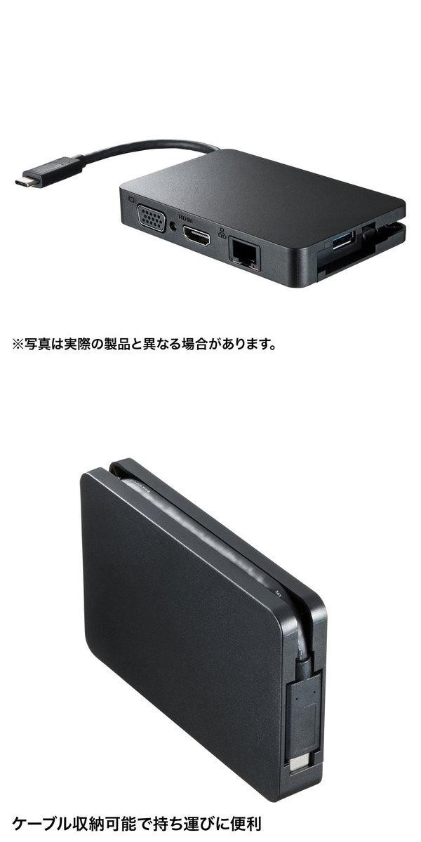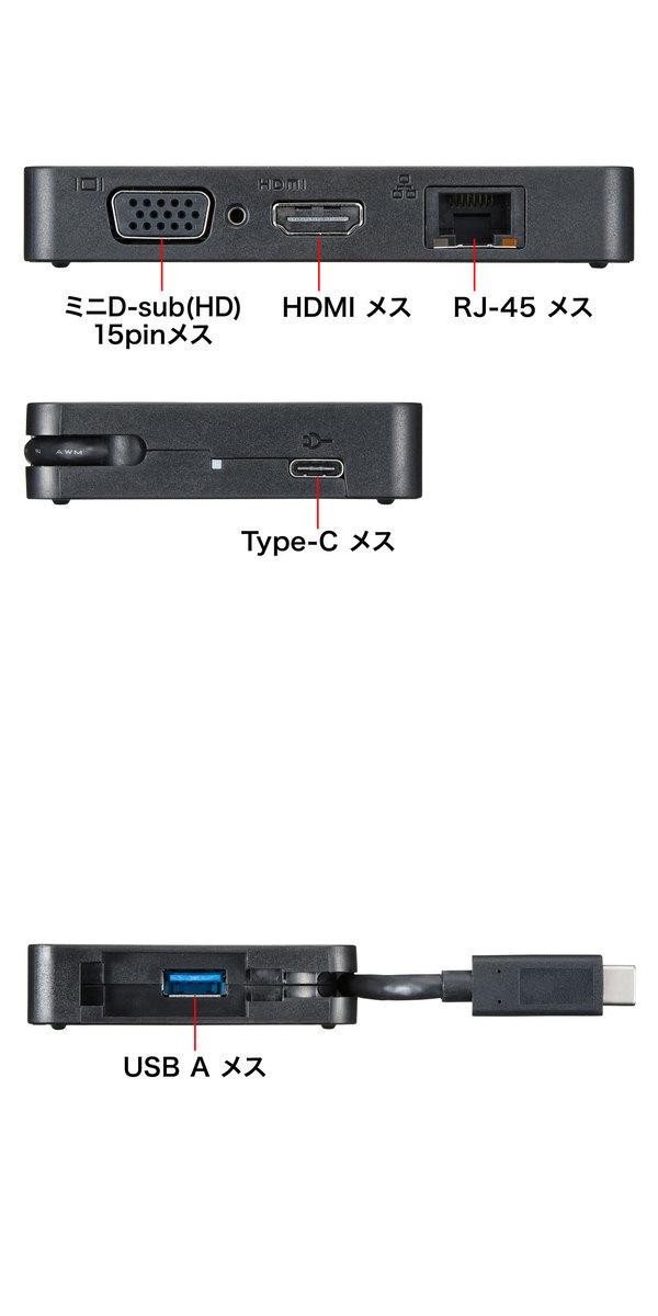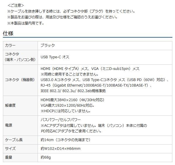 映像出力可能なUSB Type-Cポートを搭載したパソコン本体をHDMI又はVGAインターフェースを持つディスプレイ・テレビに接続するときに使用する変換アダプタです。画像出力ポートのほかに、USB3.0ポート、PD充電用のType-Cポート、LANポートがついています。 |