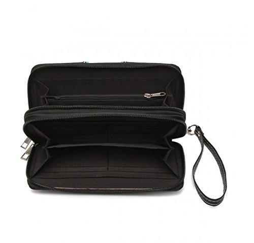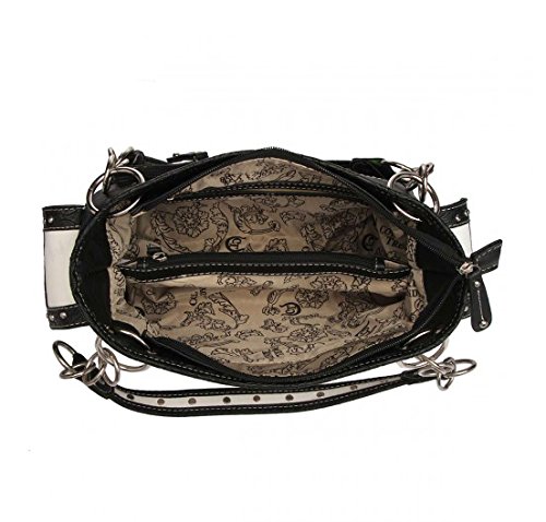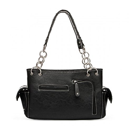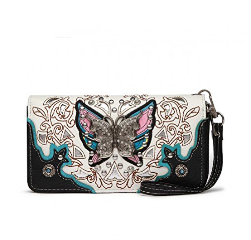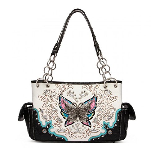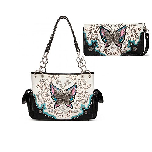 Product Description Cowgirl trendy western handbag is made from high quality tooled PU faux/imitation leather decorated with laser cut designs, rhinestones, silvertone studs, and silvertone butterfly on the front. Secure your possessions with its zip top closure. Spacious and designed to keep you organized with its single compartment fabric lined interior divided with a medium zippered pocket and a zippered wall pocket on inside rear. One secure zippered pocket on the back for a concealed carry handgun (9 inches long x 5 inches wide) and one open pocket that can fit 5 inch phone. Double flat chain handles. Two side pockets with flap that snap closed magnetically that can store your tissues, lipstick or any items you need to access quickly and easily. Metal feet on the bottom to keep the bag clean, protected and stable. Suitable for work, shopping, vacations, evenings out with friends or to show off your western bling style. 12.75 inches long X 8 inches tall x 4.75 inches wide. Matching wallet with double zipper enclosure Single, removable strap to convert the wallet into a wristlet. 1 zippered pocket for coins, flat currency compartments and open pockets with expanding bellows on the inside for coupons or receipts. 8 slots on the inside for credit cards, bank ID or business cards. 7.75 inches long X 1 inch wide X 4.5 inches tall. 0