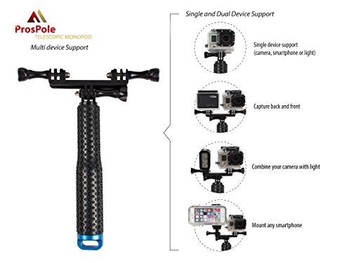 ► GET MORE FOR YOUR MONEY - The ProsPole camera pole comes with added essential accessories: (1). A double mount with 2 x long screws to mount 2 devices to the monopod at once (2). 1 x Universal Smartphone Holder (3).1 x Universal Conversion Adapter (Fits any standard Camera with a 1/4 inch-20 threading). (4) A Wrist Strap – high quality adjustable (5). A Carabiner – for easy stowing. ProsPole is backed by 100% guarantee that you are fully satisfied with your product or receive your money back.