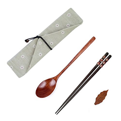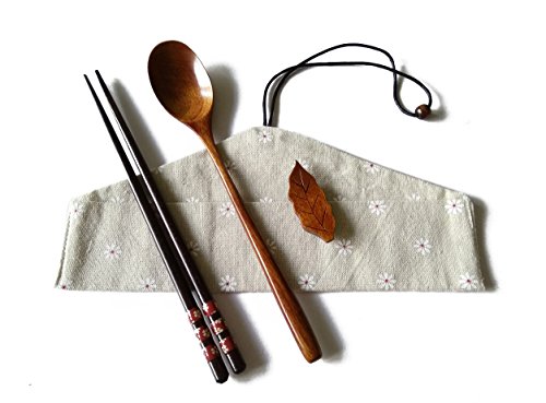 Linshing Stylish Portable Wooden Tableware Set for Lunch or Travel or Outdoor Reusable Natural Wooden Chopsticks Spoon with Cloth Bag & Chopsticks Holder