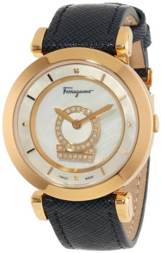 SALVATORE FERRAGAMO WOMEN'S MINUETTO DIAMOND-ACCENTED GOLD ION-PLATED WATCH WITH BLUE LEATHER BAND