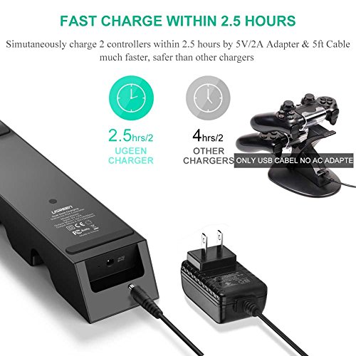 Built-in 2 Micro USB Ports: UGREEN Dual Dock Charging Station for PS4 Controller allows you to securely store and charge up two PS4 wireless controllers simultaneously without having to connect them to the PS4 system.(NOTE: 1. Do not fit for PS 4 Controller with case. 2. Only charger no PS4 controller)
