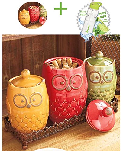 Gift Included- Decorative Kitchen Decor Food Storage Organization Owl Countertop 4-Pc. Canisters and Tray Set and FREE Bonus 23 oz Water Bottle byHomecricket