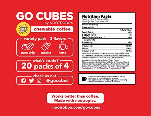 -. Feature : Box of 20 x 4-packs of GO CUBES Chewable coffee! Keep your coffee in your pocket instead of a cup. / Four gummies per pack, and each gummy is half a cup of coffee. Lasts you all day. / Three delicious flavors - mocha, pure drip, and latte (each pack is assorted). / Made for performance: 50mg caffeine, 100mg theanine, plus other supplements for focused energy on the go. / Perfect for coffee lovers - always have a perfect cube of coffee within arm's reach! Learn more at www.gocub.es