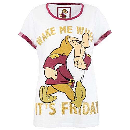 Ladies Grumpy pajamas. If mornings are not your thing, these pajamas are definitely a must for your bedtime! They feature the beloved Snow White character: Grumpy, and the slogan 'Wake me up when it's Friday' in shimmering gold glitter, all against a white background. These Grumpy pjs come with contrasting burgundy checkered trousers and a comfortable elasticated waistband, and are made of a soft cotton blend even at your grumpiest you'll love.Feature