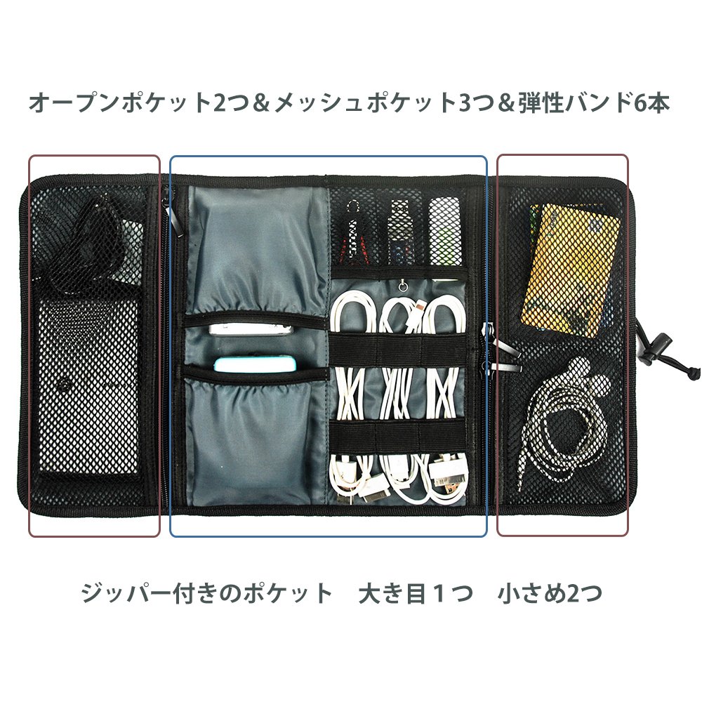 Open pocket; 3 mesh pockets for USB, SD card, SIM card, or other accessories; 6 elastic loops for cable, pen, brush, tool.