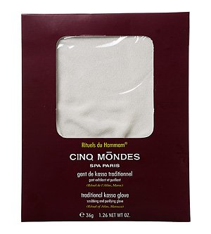 -. Feature : With over 500 000 treatments performed each year, CINQ MONDES is the leading French Spa company. / Its founder Jean-Louis Poiroux has spent over ten years travelling the globe and exploring the cultures of the world in order to bring an amalgamation of the very best in treatments and massages - "The Beauty Rituals of the World" / CINQ MONDES takes you on genuine Sensorial Journeys by virtue of a spectacular range of treatments marked by quality, authenticity and ceremony. / CINQ MONDES cosmetic products, inspired by ancient recipes and converted into cutting-edge cosmetics by a Pharmacy PhD. / A traditional scrub with kassa glove, for a gentle exfoliation of the skin.