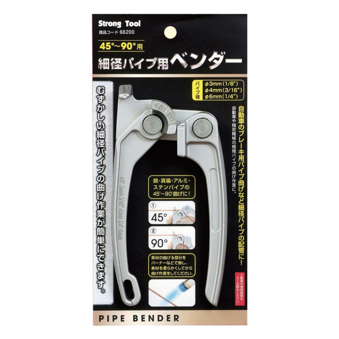 fk094igrjs自動車のブレーキ用パイプ曲げなど細径パイプの配管に サイズ 個装サイズ:20×10×4cm 重量 個装重量:150g 仕様 45度~90度用 【使用可能パイプ管サイズ】 Φ3mm Φ4mm Φ6mm 製造地 台湾 むずかしい細径パイプの曲げ作業が簡単に 自動車のブレーキ用パイプ曲げなど細径パイプの配管に