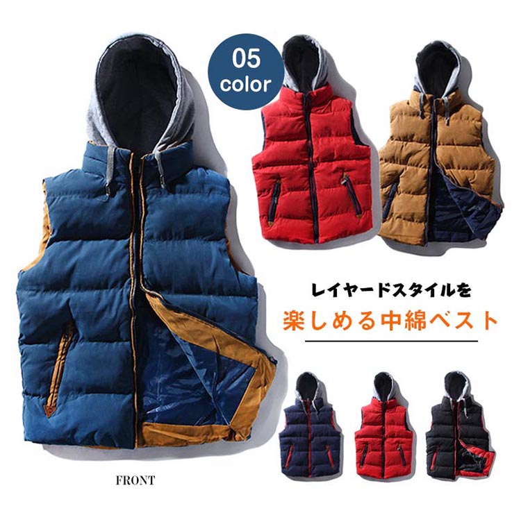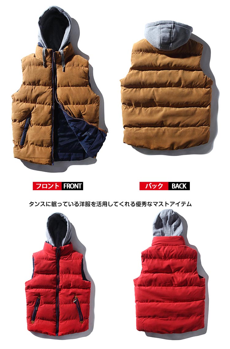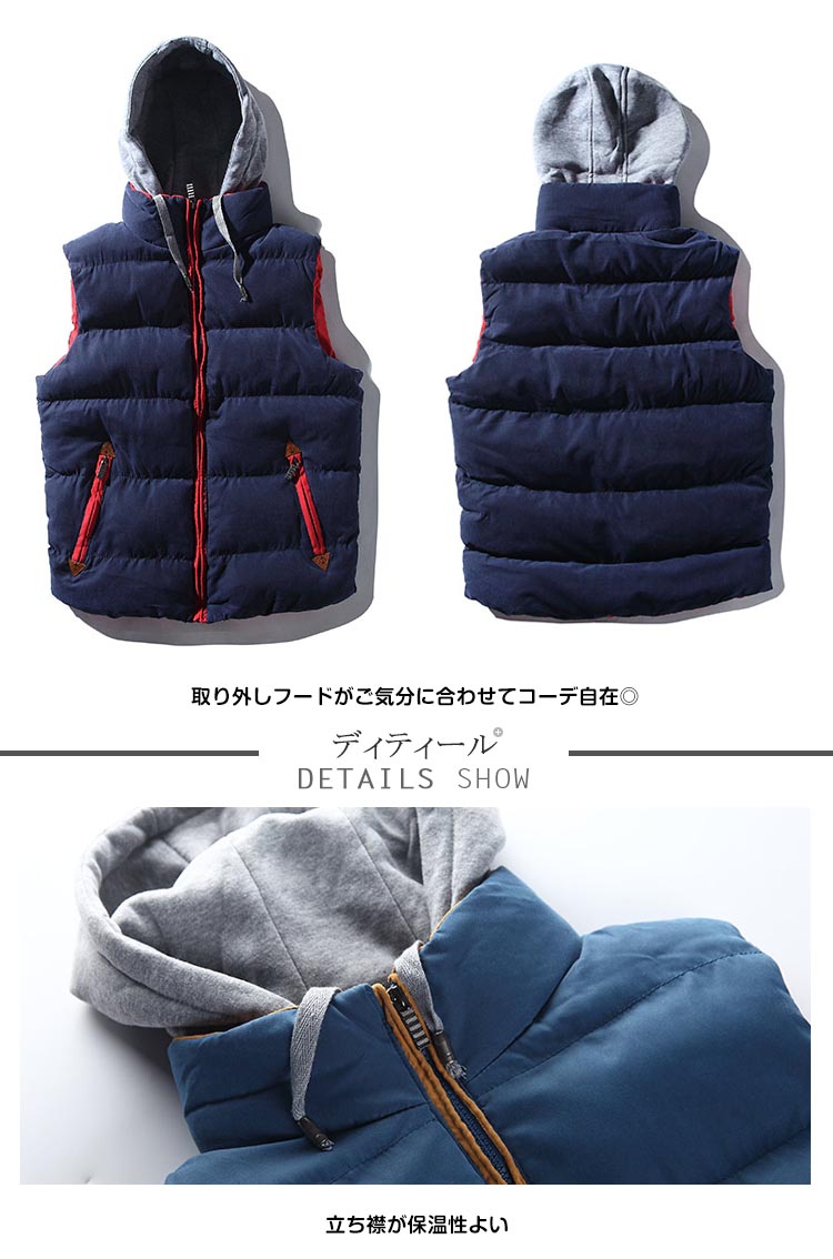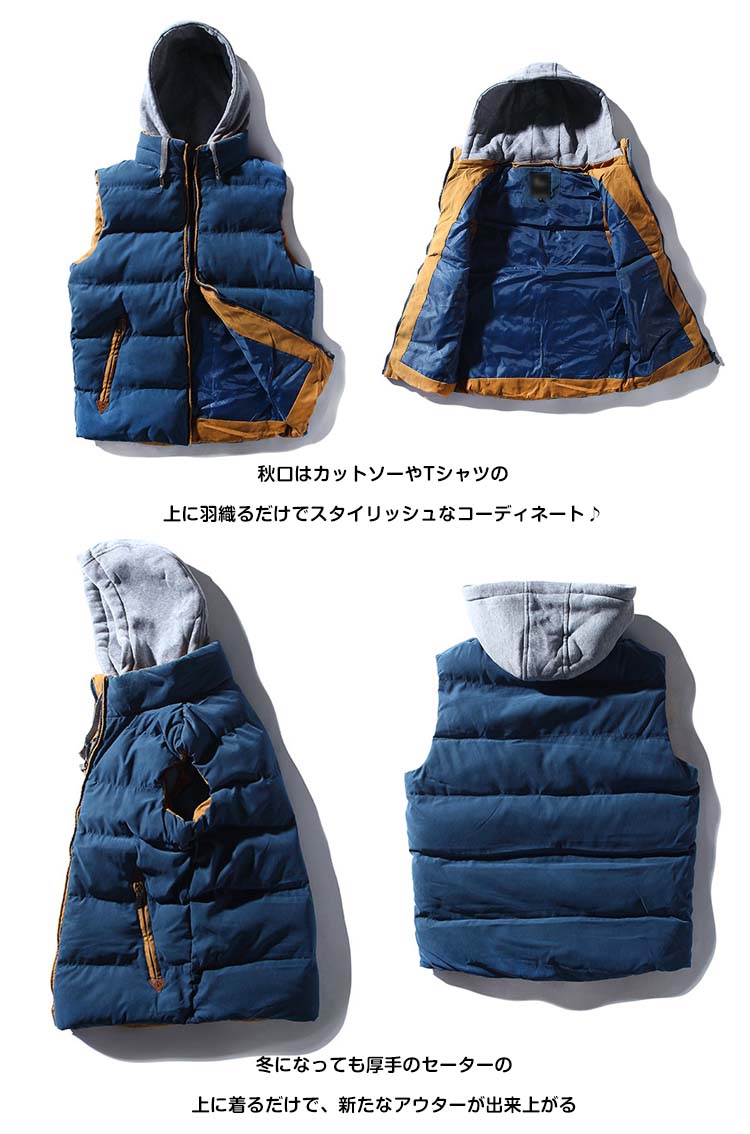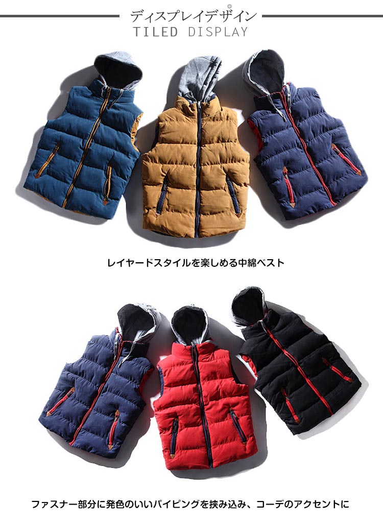 | レイヤードスタイルを楽しめる中綿ベストファスナー部分に発色のいいパイピングを挟み込み、コーデのアクセントに秋口はカットソーやTシャツの上に羽織るだけでスタイリッシュなコーディネート♪冬になっても厚手のセーターの上に着るだけで、新たなアウターが出来上がるタンスに眠っている洋服を活用してくれる優秀なマストアイテム取り外しフードがご気分に合わせてコーデ自在◎ | |