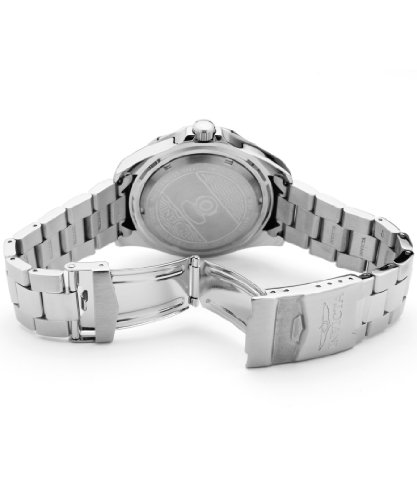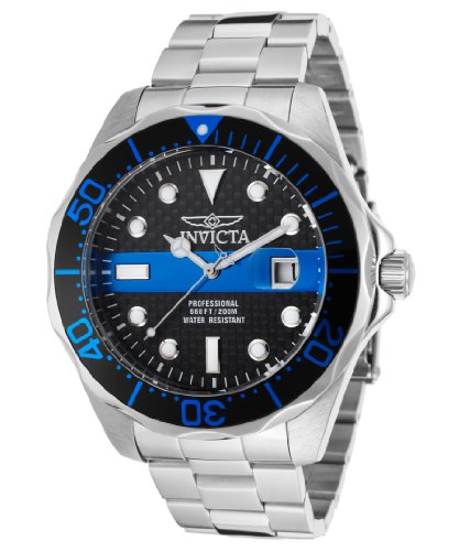 ReleaseDate : 2014-01-09 Studio : Invicta Publisher : Invicta Binding : Watch Product Description Stainless steel case with a stainless steel bracelet. Uni-directional rotating stainless steel bezel with blue top ring. Carbon fiber dial with blue stripe luminous hands and dot hour markers. Minute markers around the outer rim. Dial Type: Analog. Luminescent hands and markers. Date display at the 3 o'clock position. Quartz movement. Scratch resistant mineral crystal. Pull / push crown. Solid case back. Case diameter: 47 mm. Round case shape. Band width: 22 mm. Band length: 8.5 inches. Fold over deployment clasp. Water resistant at 200 meters / 660 feet. Functions: date, hour, minute, second. Casual watch style. Invicta Pro Diver Carbon Fiber Dial Stainless Steel Mens Watch 14702. 0