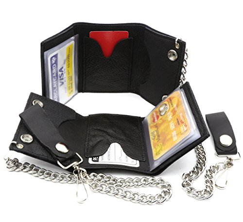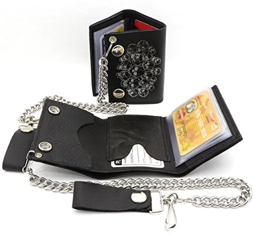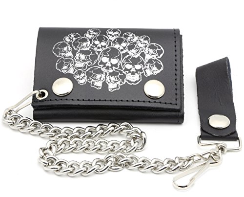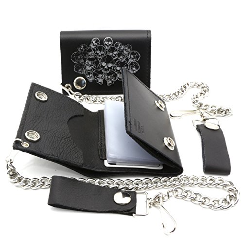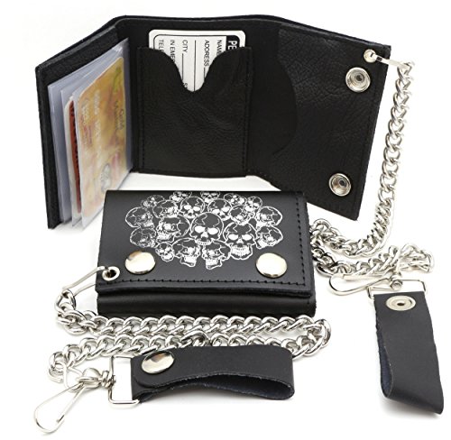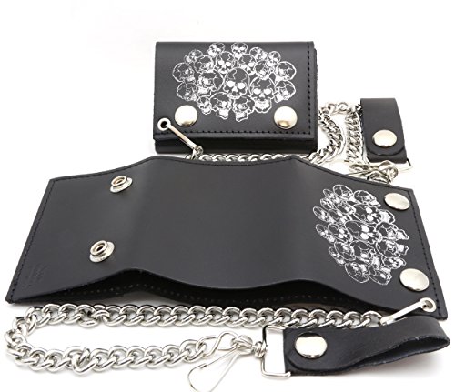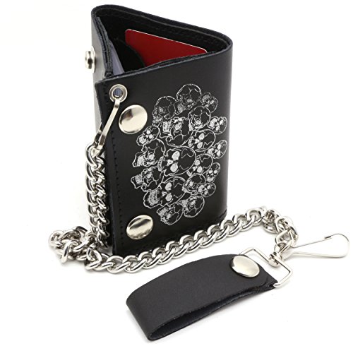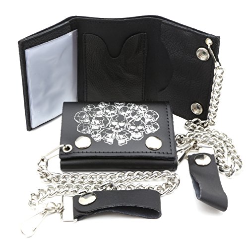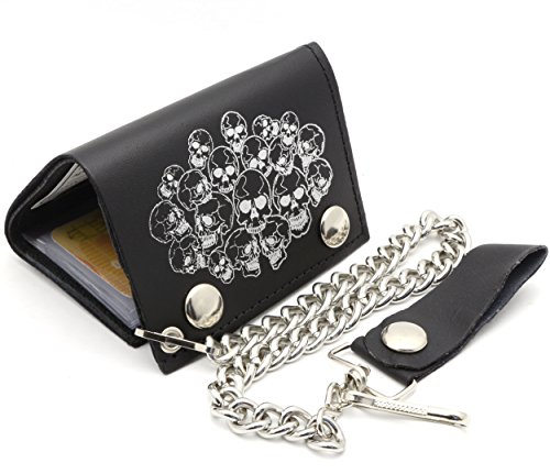 Product Description Trifold USA made Black genuine leather biker wallet with a pile of skulls design and a removable chain. Includes clear sleeves for pictures or cards. Length: 11 cm Width: 8 cm Chain length: 12 inches (14 inches including the strap and hook) 0