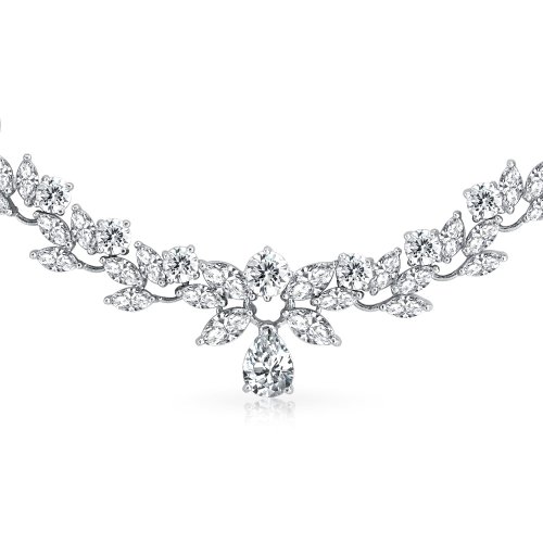 This rhodium plated tennis necklace is the perfect nature inspired jewelry to wear this spring. The 18in of marquise cut CZ leaves gives this a sparkling bridal look that she's sure to love. With a 0.78in teardrop focal point, this is the perfect elegant accessory.