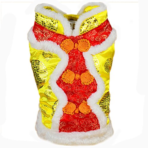 -. Feature : Color: Red,Yellow / Size: XS,S,M,L,XL / Material: Outside is silk + inside is fleece / Pet clothing style: Tang costumes / Cardigan button design, easy to wear.