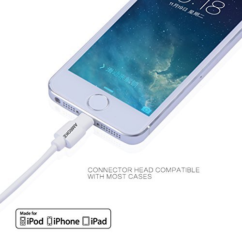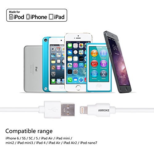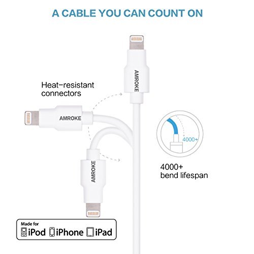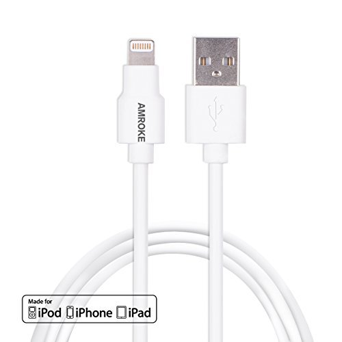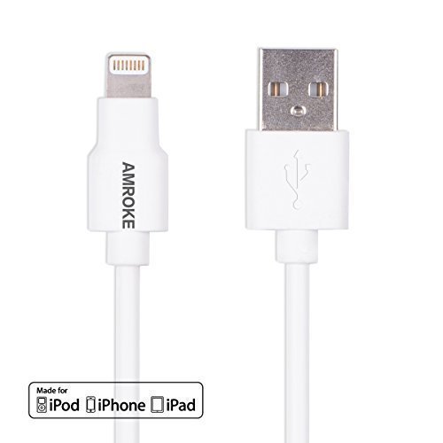 Amroke 3367296 8-Pin Sync & Charge USB Cable with Lightning Connector for 6s, 6 Plus, 5s, 5c, 5, iPad Pro Air 2, iPad mini 4, 3, 2, iPod touch, iPod nano 7th Gen, 6.5 ft - White (Apple MFi Certified)