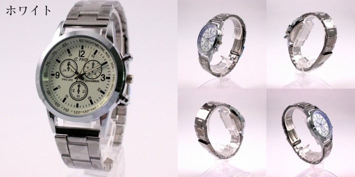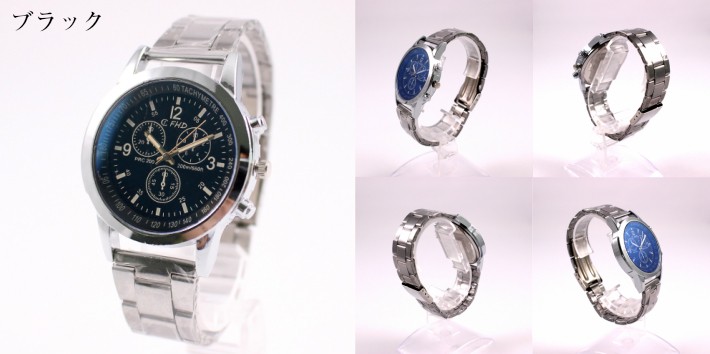 【仕様】アナログ表示 クォーツ(電池式) 日常生活防水 三つ折れ※電池入り+替えの電池1個(使用開始時は側面のリューズを押してください。)【素材】バンド:合金 ケース:合金【サイズ】腕回り:約200mm~205mmバンド幅 :約18mm文字盤直径:約41mm文字盤厚み:約9mm重量:約70g商品発送時は、動作確認用の電池が内蔵されております。使用開始時は、側面のリューズ(つまみ)を押して下さい。電池の残量につきましては、製造時期により差が生じますのでご了承下さい。付属の新品電池は、電池交換の際にご使用下さい。※クロノグラフ、ストップウォッチ機能につきましては飾りとなっております。※箱・説明書・保証書は付属しておりません。※バンド交換の際は、お近くの時計店までよろしくお願い致します。※ステンレスバンドのコマ外しはできない仕様になっております。※製造時期により予告なく、若干の仕様変更がある場合がございます。※ご使用のPC環境により実際の商品と色味が異なって見える場合がございます。 ご了承、よろしくお願い申し上げます。