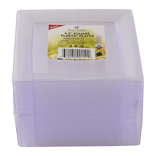 Premium Hard Plastic Plate Set By Oasis Creations - 50 x 6.5" Clear Square Plates - Disposable or Reusable
