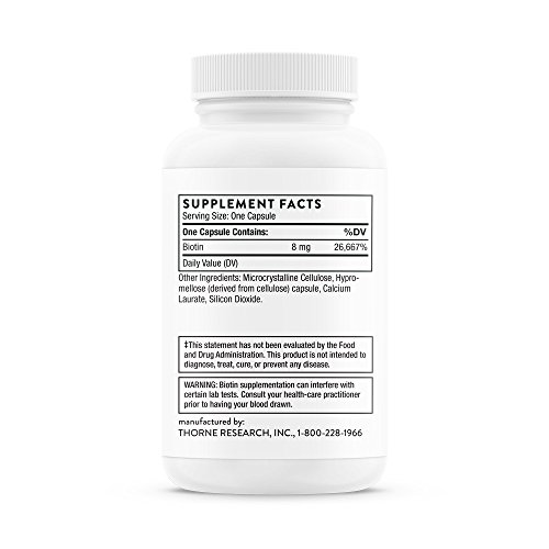 Containing 8 mg of biotin per capsule.Since 1984, Thorne has set the standard for the exceptional formulation and quality manufacturing of nutritional supplements. Thorne delivers premium, science-based products, a health diagnostics technology platform, and the latest in medical education. With more than 350 products, Thorne is the most dispensed brand by 30-40 year old health-care practitioners. Thorne is dedicated to improving the health of our community as well as increasing the knowledge of nutritional health and wellness. Since 2012, Thorne has partnered with educational institutes and local charities to donate more than $1M in products and profits.