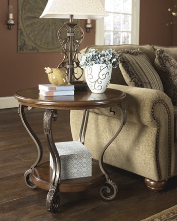 -. Brand : Ashley Furniture -. Color : Medium Brown -. Feature : Tops made with select veneers in a medium burnished finish / Scroll legs have wirework detail / Metal is finished in a warm light bronze color finish / From shelf to apron:18 1/4h / Shelf: 18 3/4w x 18 3/4d x 1 5/8h -. Label : Ashley Furniture -. Manufacturer : Ashley Furniture -. MPN : T517-6 -. PackageQuantity : 1 -. PartNumber : T517-6 -. ProductGroup : Furniture -. ProductTypeName : HOME_FURNITURE_AND_DECOR -. Publisher : Ashley Furniture -. Studio : Ashley Furniture -. Title : Signature Design by Ashley Nestor Round End Table