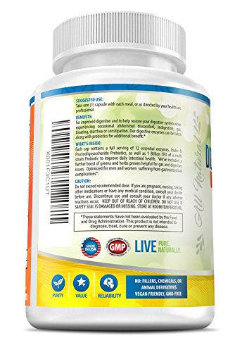 ✓ OPTIMIZED FORMULA - Naticura's Digestive Enzymes are formulated with a thoughtful balance of non-GMO plant based enzymes, Inulin & Fructooligosaccharide Prebiotics as well as 1 Billion CFU of a multi strain Probiotic to improve daily intestinal health. We've included a further boost of greens and herbs traditionally used for digestive issues. Optimized for men and women suffering from gastrointestinal complications including IBS, constipation or diarrhea.