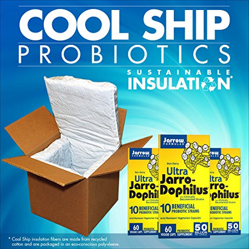 Ultra Jarro-Dophilus is a high potency probiotic supplement designed to restore, protect and maintain a balanced intestinal flora. A maximum survival of viable cells through the stomach and the intestinal tract is made possible by a triple-component delivery system consisting of a vegetarian acid resistant capsule, and the integration of the probiotic strains with a gel forming matrix. The gel forming matrix helps provide protection to probiotic bacteria against negative effects of stomach and/or duodenal fluids. Each capsule contains a minimum of 50 billion viable cells when kept refrigerated and within best used before date. The cool ship process creates a custom fulfillment pathway so that probiotic products are kept refrigerated up until the point they are shipped. The products are packed in a unique cool ship box that utilizes insulation made with sustainable cotton fiber and cooled with reusable ice packs. The products are then fulfilled with either next day or second day shipping. This process delivers probiotics that have been kept cool and, in most cases, not exposed to prolonged extreme heat, supporting the highest levels of product potency.Feature