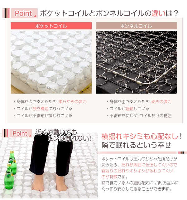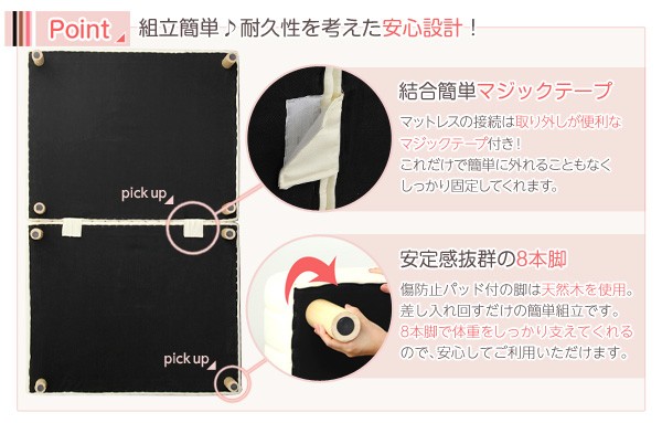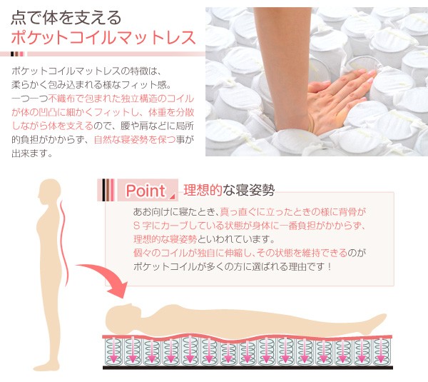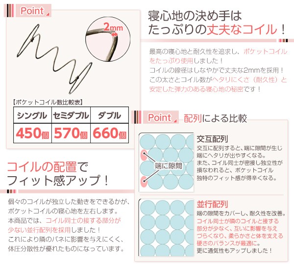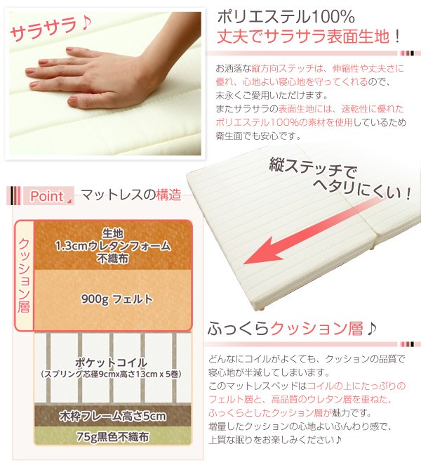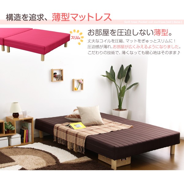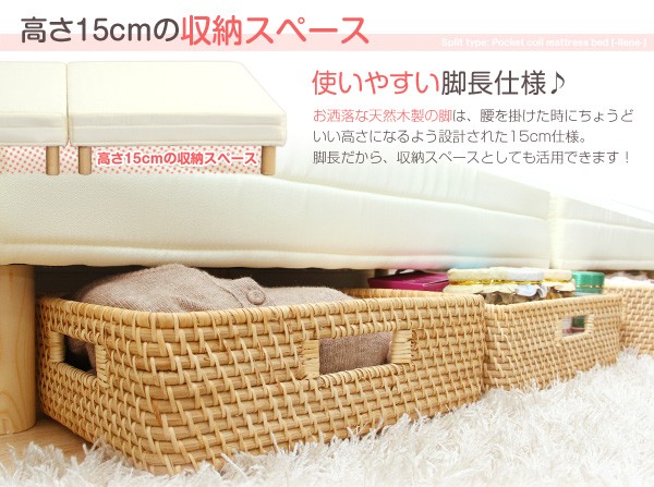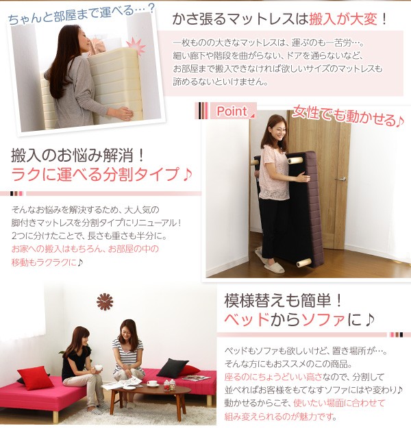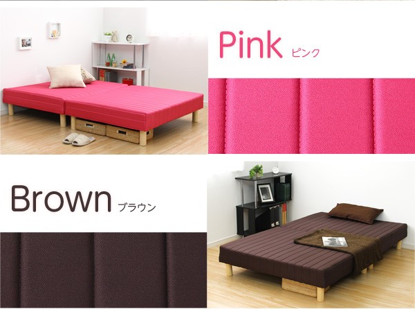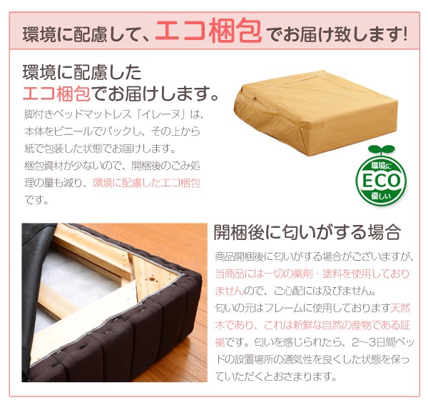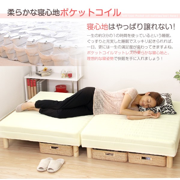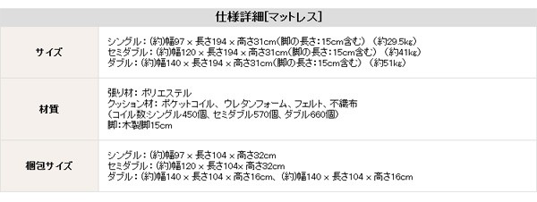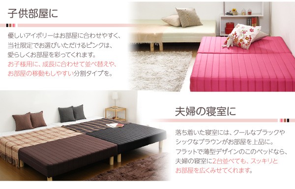 【商品について】脚付きマットレスベッド【-Ilene-イレーヌ】(ポケットコイル・セミダブル用)移動がラクな分割式タイプ!■サイズ:セミダブル:(約)幅120x長さ194x高さ31cm(脚の長さ:15cm含む)※商品重量:約41kg■カラー:ブラック アイボリー ブラウン ピンク■素材:貼り材:ポリエステルクッション材:ポケットコイル、ウレタンフォーム、フェルト、不織布(コイル数:シングル450個、セミダブル570個、ダブル660個)脚:木製脚15cm■その他:・お客様組立商品ですセミダブル:梱包サイズ:(約)幅120x長さ104x高さ32cm (約14.7才)※梱包重量:約42kg ※メーカー直送品、商品代引き不可