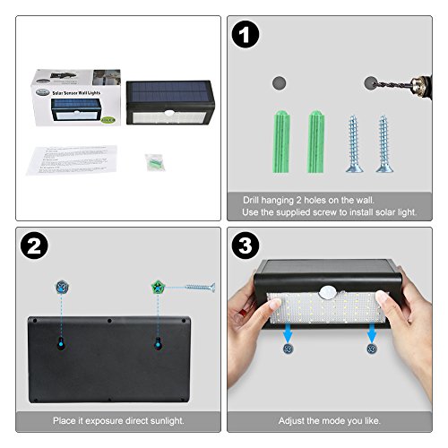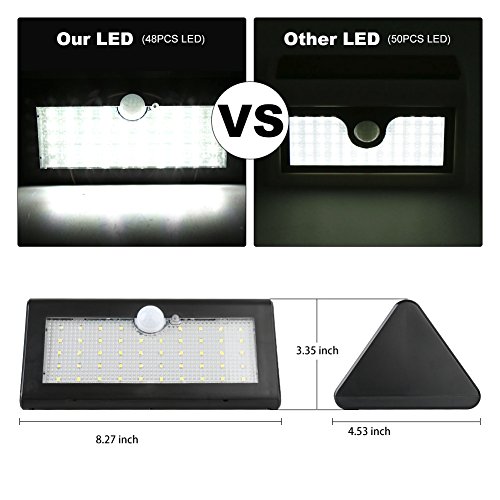 [48-LED solar lights] Solar panel power:5.5V 2.5W,Waterproof:IP65,Max Luminous:800,Sensing Range/Angle:15-30feet 120º,Charging time:4-6 hours,Work time:7-10 hours.