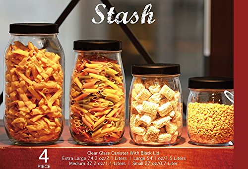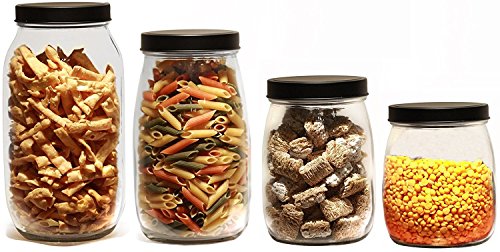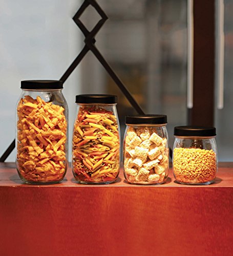 Set of 4 Glass kitchen Canister Set, Airtight Mason Container Jars, with Black Lids, 74oz, 54oz, 37oz and 27 Ounce, Holds Food, Coffee, Sugar Tea etc.