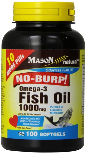 NO-BURP Ordorless Fish Oil 1000 mg of Omega-3 has been purified to eliminate mercury. It may reduce the risk of coronary heart disease. Legal Disclaimer: These statements have not been evaluated by the Food and Drug Administration. This product is not intended to diagnose,treat,cure or prevent ant disease. This product has been manufactured and packaged in strict conformance with industry & government standards. Mason Natural®is a registered trademark and does not refer to any product claim.Feature