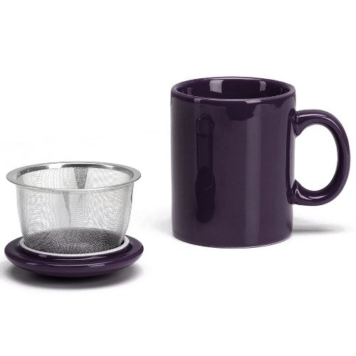 Studio : Omniware Publisher : Omniware Product Description Enjoy hot or cold tea anytime, anywhere with Omniware's infuser mug. Made from aubergine ceramic. It comes with a matching lid that doubles as a place to set down your stainless steel infuser after use. This mug will infuse any loose leaf tea of your desire, and has a convenient handle for easy transport. Best of all, it is dishwasher safe, making cleanup a breeze. 5" L x 4" W x 5" H, with an 11 ounce capacity 0