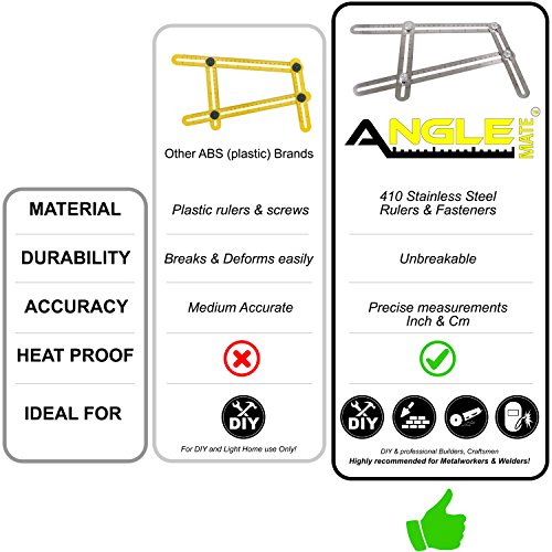 - MADE WITH DURABLE 410 STAINLESS STEEL - No cheap plastic here! Wont split or crack in your tool box. Slim profile compared to plastic and aluminum angleizer tools means measurements are taken closer to the work surface resulting in greater accuracy. Minimize wasted materials, maximize your time and efficiency with this indispensable tool. UPGRADED Stainless Steel knobs are much easier to work with compared to wingnut knobs found elsewhere