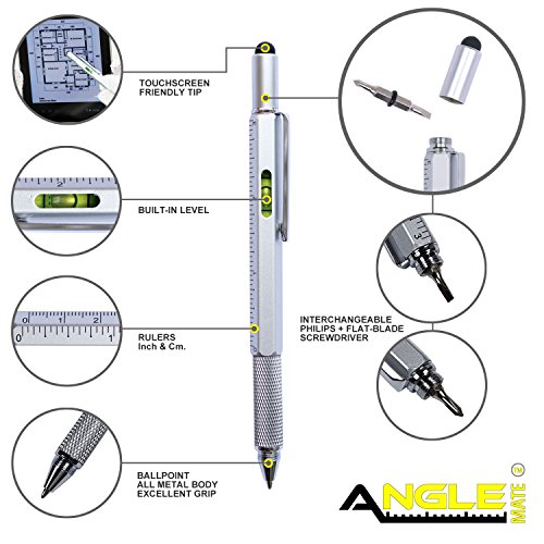 - FREE ALUMINUM MULTI-TOOL PEN WITH SPIRIT LEVEL INCLUDED. Your new handy 6-in-1 companion has a built in stylus, interchangeable philips and flate blade screwdriver, spirit level, mini ruler and of course, its a ball point pen! Please see photo. Just think of the convenience this great little multitool pen offers. Perfect for quick fixes, use it to ensure level wall hangings or simply jot down your accurate measurements from your Angle Mate™ template tool