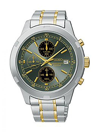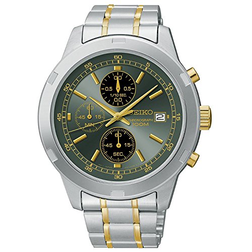Seiko Chronograph Sports Watch Two Tone Band and Case Precision Chronograph Movement Push Button Fold Over Clasp Water resistant 100 Meter