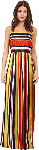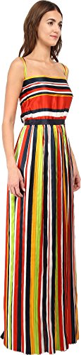 Maxi silhouette. Deep square neckline. Sleeveless. Breathtaking stripes throughout. Invisible side button, hook, and zip closure. Plissé skirt detail. Straight floor-length hemline with left side vent. 100% silk. Professional dry clean only. Made in Italy.
