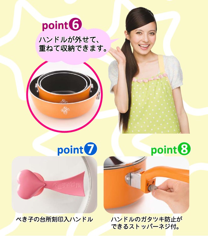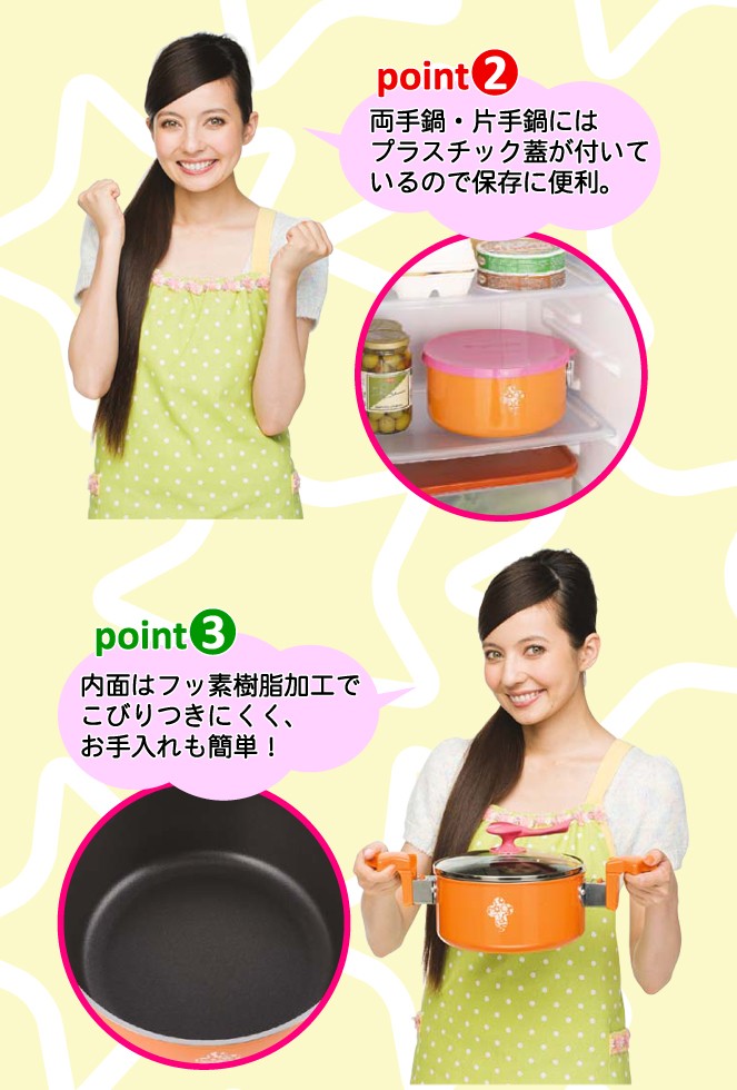 | 材質 | 本体=アルミニウム 底部=ステンレス銅はり底(18-0ステンレス) 内面=ナヴァロン フッ素樹脂焼付 ハンドル・ツマミ=メラミン樹脂 蓋=強化ガラス プラスチック製=ポリエチレン |