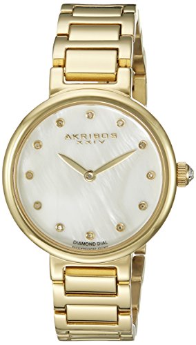 Studio : TWI Watches, LLC Publisher : TWI Watches, LLC Binding : Watch Product Description This lovely AKRIBOS XXIV Ladies' timepiece features an elegant and petite case design measuring 30mm in diameter with gorgeous yellow gold plating. It is powered by a reliable and accurate Japanese quartz movement with a classic two-hand display over a scintillating mother-of-pear dial, and genuine conflict-free diamond markers. This timepiece is completed with a beautifully polished stainless steel link bracelet with matching yellow gold finish. 0