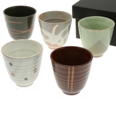-. Feature : Set of 5 cups / Eight ounce capacity / Handcrafted / Microwave and dishwasher safe / Made in Japan