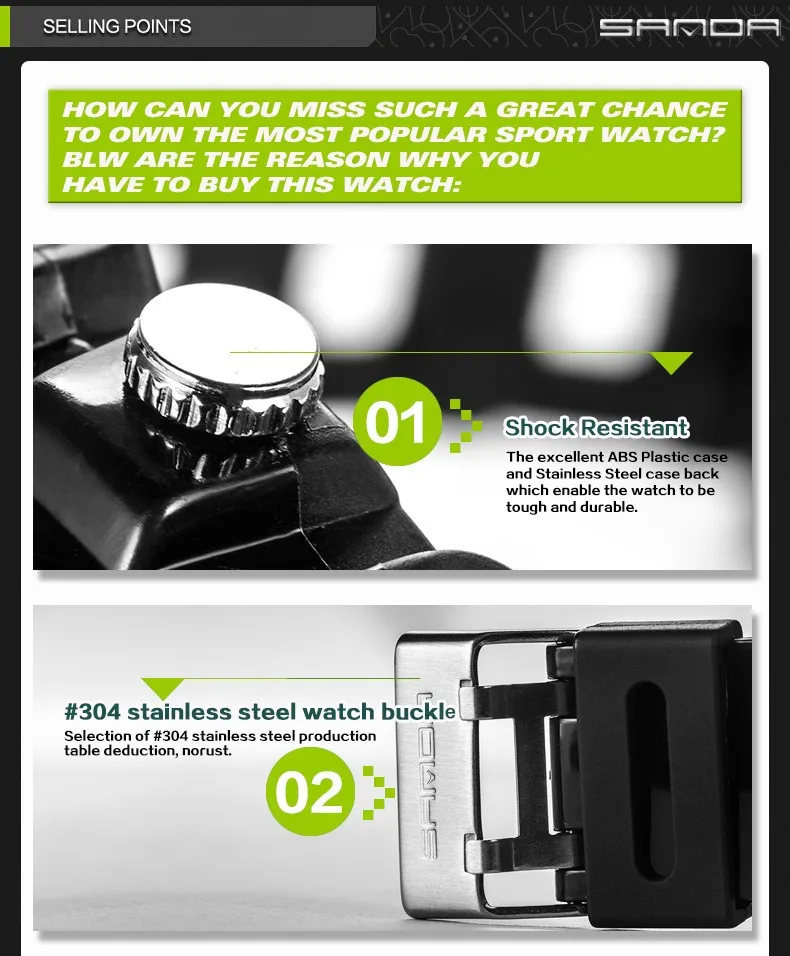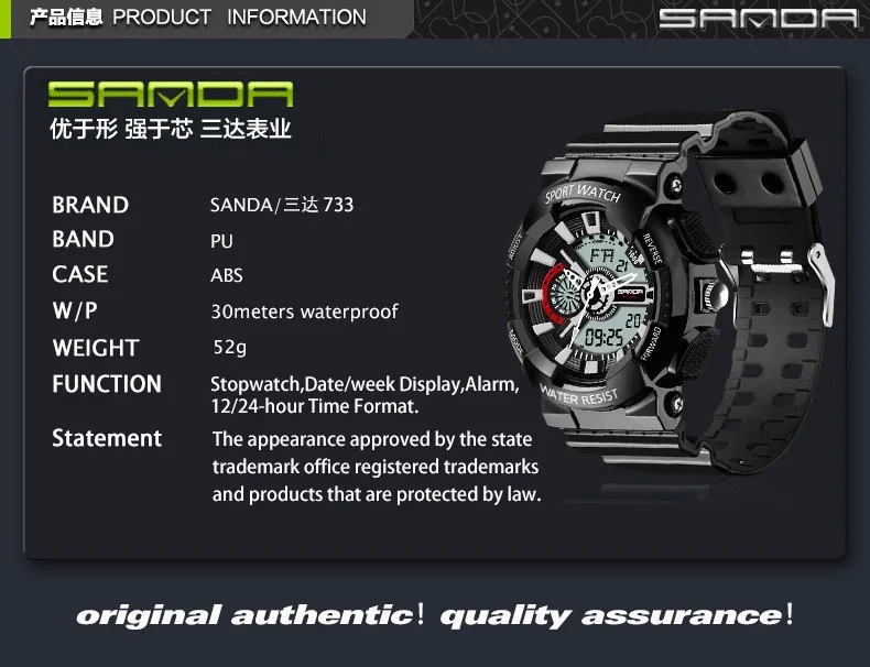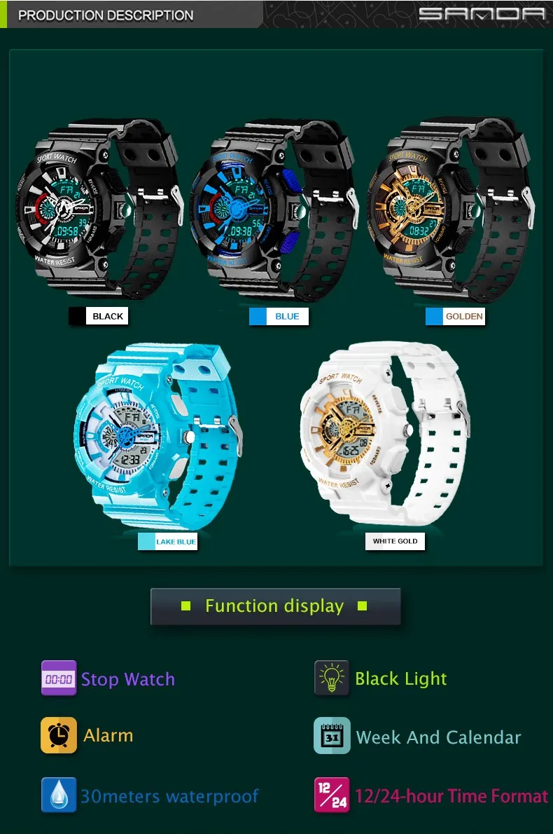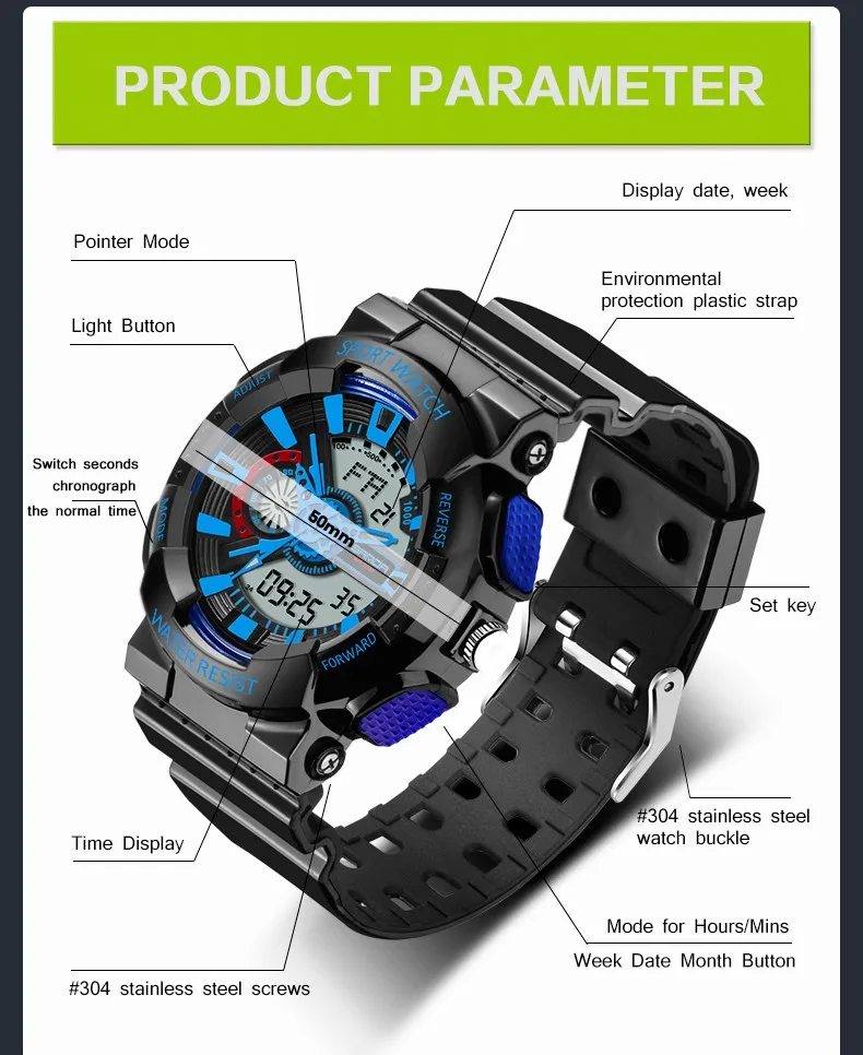 Feature:Water Resistant,LED display,Luminous,Back Light,Complete Calendar,Shock Resistant,Chronograph,Auto Date,Week Display,Alarm,Swim