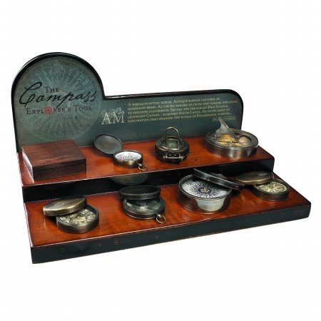 Studio : Authentic Models Publisher : Authentic Models Product Description A mini collection that covers three centuries of compass development. Its context is history, science, navigation, exploration, and timekeeping. Iconic and interesting, no other instrument has had a similar appeal to collectors and professionals. Iconic for all ages. Superb reproductions, all correctly priced. Present your AM compasses as a collection on this French finished wood display complete with story of the compass as an explorer's tool. Throw in the Discovery Glass as a fun and sweet bonus. 0