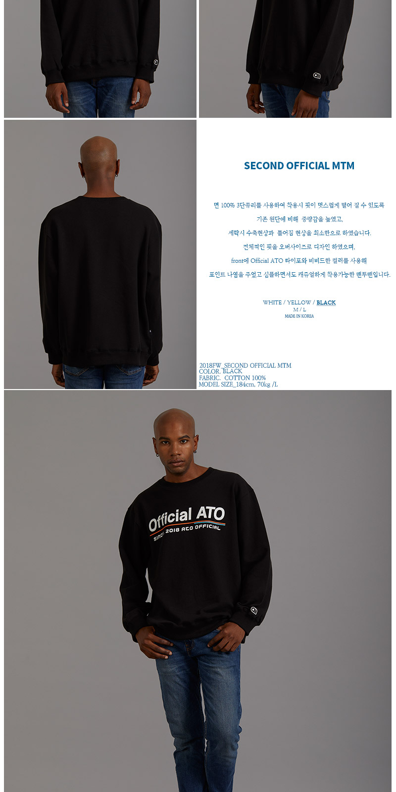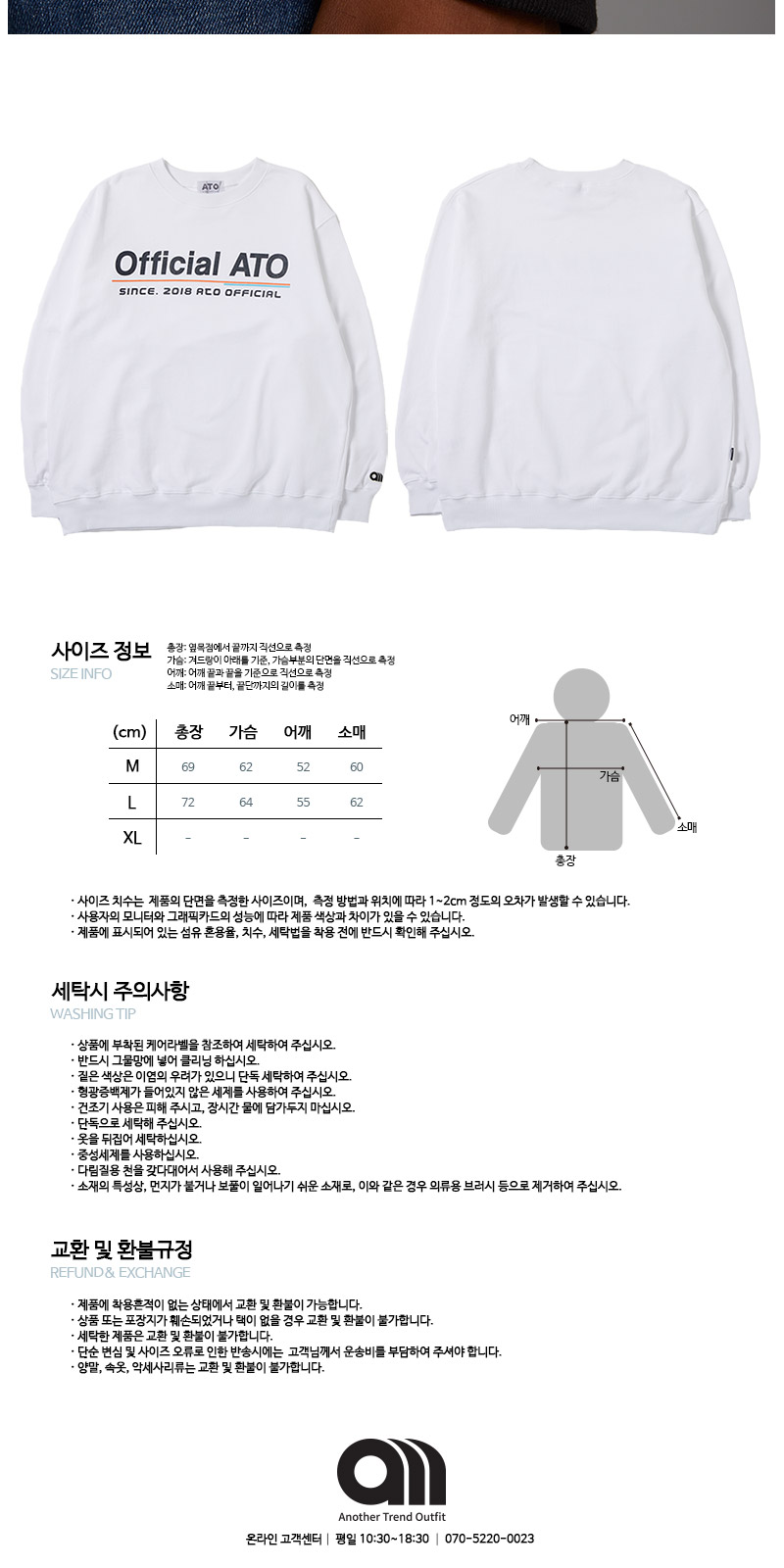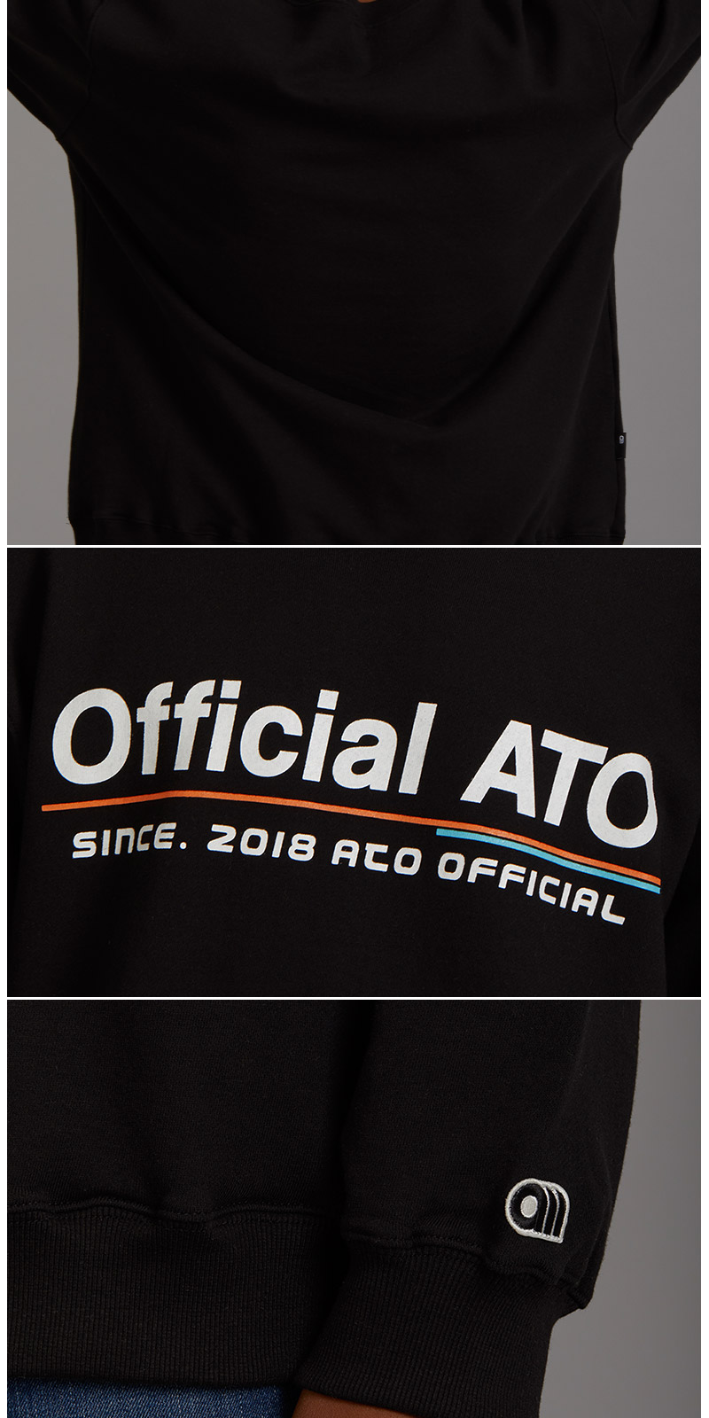 전체적인 핏을 오버사이즈로 디자인 하였으며, front에 Official ATO 타이포와 비비드한 컬러를 사용해 포인트 나염을 주었고 심플하면서도 캐쥬얼하게 착용가능한 맨투맨입니다.