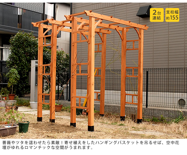 ●幅と奥行を二段階調整できるだけでなく、 同じアーチを連結させて、藤棚や葡萄棚のようなトンネル状のパーゴラを設置することもできます