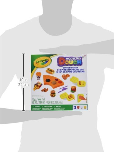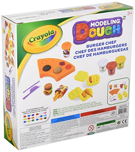 Let your little chefs imagination run wild! your child will have hours of fun using this Crayola dough burger chef kit to create their favorite foods! this kit includes 3 - 2oz tubs of assorted color dough, 3 molds, 2 modeling tools, 1 food stick, 1 drinking cup, 1 paper food box. Recommended for ages 3 years and up.Feature