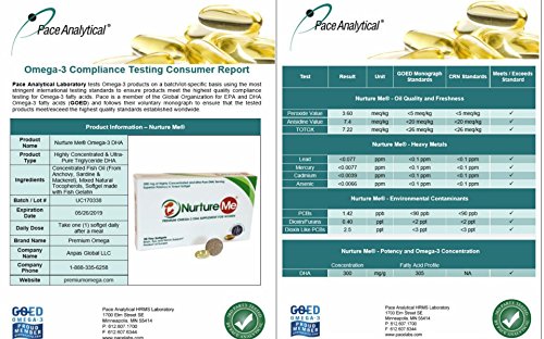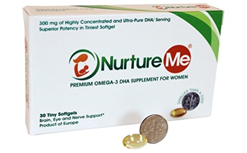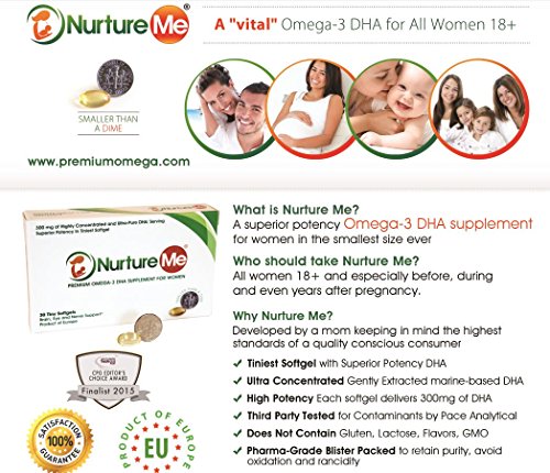 Pharmaceutical Grade DHA Supplement for Women's Health. Nurture Me was voted Top 5 Women's Health Supplement by the CPG Editor's Choice Award in 2015. Made with the Highest Concentration Triglyceride DHA in the Smallest Pill Size (Smaller than a Dime). Backed and Approved by Doctors from the Hershey's Medical Center University of Pennsylvania. Beneficial for woman between 18 to 55 years, especially years before, during and even years after pregnancy. Each softgel has 300 mg of Ultra-Pure DHA which is more than the recommended dose by health experts and agencies. Nurture Me is individually wrapped in Pharma-Grade Blister Strip Packaging to preserve freshness, reduce oxidation and increase product stability. Third-Party Tested and certified for Mercury, Toxins and other Contaminants. (See our Consumer Test Report Image) No GMO, No Artificial Flavors, No Additives, No Preservatives, No Soy. Softgels are made with Fish Gelatin (No Other Animal Parts Used) INGREDIENTS: Concentrated Omega-3 Fish Oil (from Anchovy, Sardine & Mackerel), Mixed Tocopherols, Softgel (Fish Gelatin, Glycerin, Purified Water) *[*These statements have not been evaluated by the Food and Drug Administration.]Feature