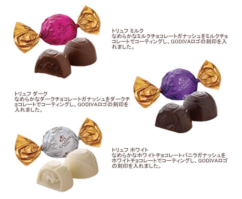 ラッピングトリュフ9粒詰め合わせ(ミルク、ダーク、ホワイト) 【ショッピングバッグ】の有無:「ゴディバジャパンが発送」を選択された場合、同梱されますサイズ :77×77×85mm 約175g 賞味期限:1ヶ月以上のものをお送りしております。保管方法:涼しい場所(15℃~18℃が適温です)で保存してください。ご注文後のキャンセル・変更はお受けできませんので、ご了承ください。