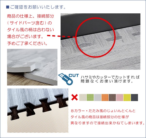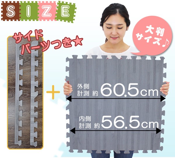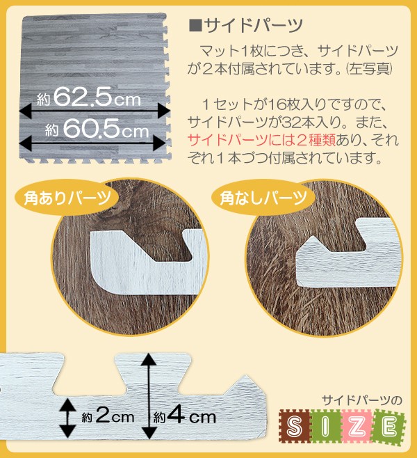 【和式たたみ風】★1枚あたり外寸(約):幅63.5×奥行63.5×厚み1cm(サイドパーツ分含む) 【洋式木目タイル調】★1枚あたり外寸(約):幅62.5×奥行62.5×厚み1cm(サイドパーツ分含む)【セット内容】ジョイントマット16枚サイドパーツ(角付きパーツ16本、角なしパーツ16本 )