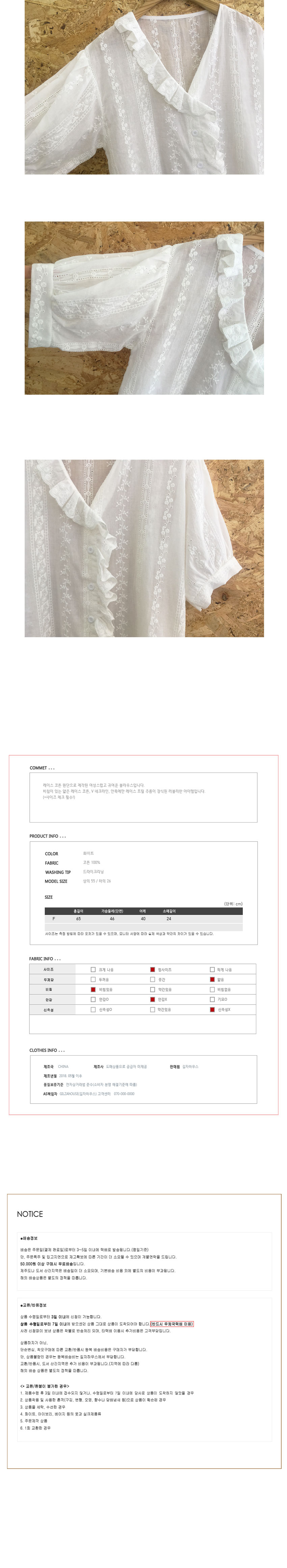 Free(단면): 가슴둘레 46cm, 어깨 40cm, 소매 24cm, 총장 65cm (*사이즈 체크!!)
