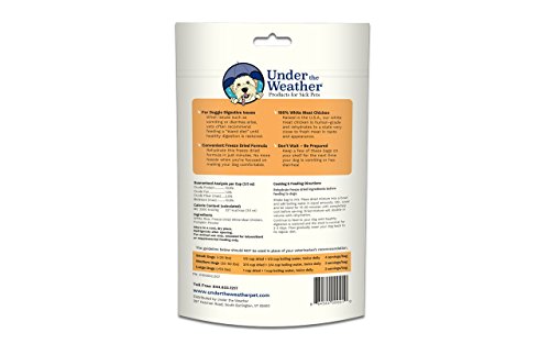 -. Binding : Misc. -. Brand : Under the Weather Pet -. Feature : Convenient, Soothes digestion, 100% human-grade meat, Gluten free -. Label : Under the Weather -. Manufacturer : Under the Weather -. PackageQuantity : 1 -. ProductGroup : Pet Products -. ProductTypeName : PET_SUPPLIES -. Publisher : Under the Weather -. Studio : Under the Weather -. Title : Under the Weather - Convenient Bland Diet for Sick Pets (freeze dried) - Gluten Free - All natural - 100% human grade meats - Dogs Love the Taste! 3 Flavors!