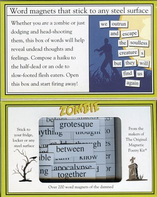 -. Binding : Kitchen -. Brand : Magnetic Poetry -. Color : White -. EAN : 0602394031198 -. Feature : Compose homages to slow-walking brain-eaters. Or just post reminders that they must be destroyed by a headshot / Kit contains over 200 themed magnetic word tiles / Tile height is .375" / Package size is 4.75w x 3h x 1.25 d Inches / Made in USA -. Label : Magnetic Poetry -. Manufacturer : Magnetic Poetry -. Model : 3119 -. MPN : 3119 -. PackageQuantity : 1 -. PartNumber : 3119 -. ProductGroup : Home -. ProductTypeName : HOME -. Publisher : Magnetic Poetry -. Size : 4.75" x 3" x 1.25" -. Studio : Magnetic Poetry -. Title : Magnetic Poetry - Zombie Kit - Words for Refrigerator - Write Ps and Letters on the Fridge -. UPC : 602394031198