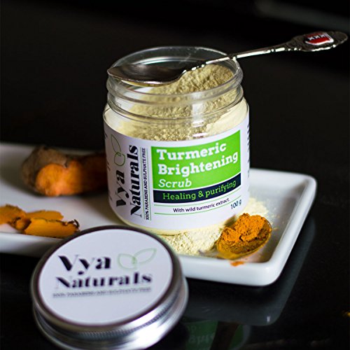 DRY TURMERIC FACE SCRUB- This is a powder exfoliant and can be used as part of a turmeric facial. Mix 1 teaspoon of Turmeric Brightening Scrub with Vya Naturals Rose Luxury Toner or milk or yoghurt to form a paste. Apply as face mask on cleansed face. Scrub off after 10 mins in gentle circular motions. Rinse & pat dry. Follow up with a moisturizing cream.